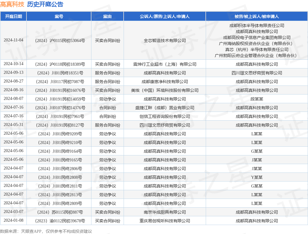 根据统计,近一年内以成都高真科技有限公司为当事人的历史开庭公告有25则,其中案由为“买卖合同纠纷”的公告以10则居首,其次为“劳动争议”有10则,“服务合同纠纷”有3则。历史开庭公告(前20条)如下: