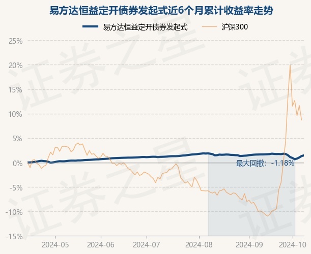 证券之星消息,10月15日,易方达恒益定开债券发起式最新单位净值为1.0344元,累计净值为1.2884元,较前一交易日上涨0.13%。历史数据显示该基金近1个月下跌0.27%,近3个月上涨0.18%,近6个月上涨1.45%,近1年上涨4.35%。该基金近6个月的累计收益率走势如下图: