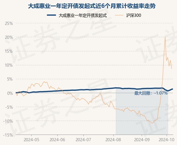 证券之星消息,10月15日,大成惠业一年定开债发起式最新单位净值为1.0044元,累计净值为1.1194元,较前一交易日上涨0.09%。历史数据显示该基金近1个月下跌0.25%,近3个月上涨0.13%,近6个月上涨1.35%,近1年上涨5.41%。该基金近6个月的累计收益率走势如下图: