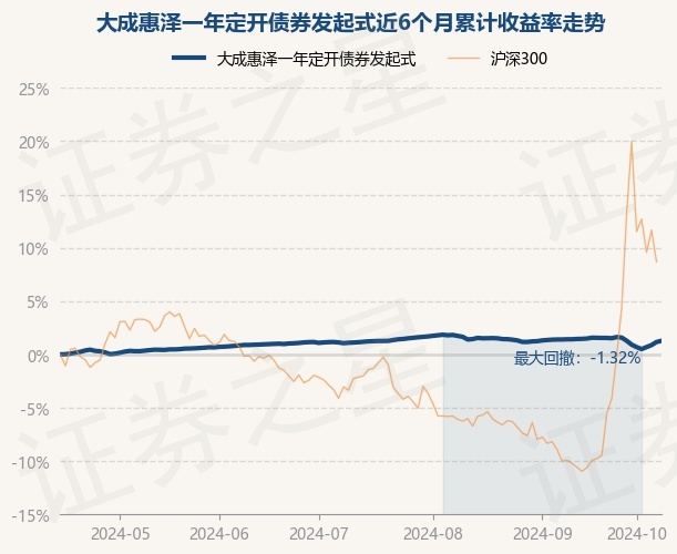 证券之星消息,10月15日,大成惠泽一年定开债券发起式最新单位净值为1.0246元,累计净值为1.1188元,较前一交易日上涨0.11%。历史数据显示该基金近1个月下跌0.21%,近3个月上涨0.05%,近6个月上涨1.27%,近1年上涨4.43%。该基金近6个月的累计收益率走势如下图: