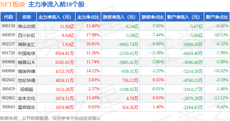 从资金流向上来看,当日NFT板块主力资金净流入18.21亿元,游资资金净流出11.69亿元,散户资金净流出6.52亿元。NFT板块个股资金流向见下表: