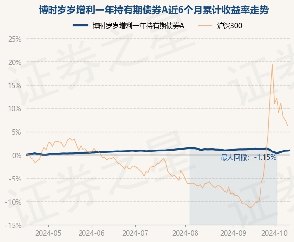 证券之星消息,10月17日,博时岁岁增利一年持有期债券A最新单位净值为1.225元,累计净值为1.7344元,较前一交易日上涨0.06%。历史数据显示该基金近1个月下跌0.34%,近3个月上涨0.0%,近6个月上涨0.94%,近1年上涨3.84%。该基金近6个月的累计收益率走势如下图: