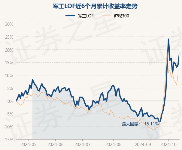 证券之星消息,10月18日,军工LOF最新单位净值为1.016元,累计净值为1.72元,较前一交易日上涨3.46%。历史数据显示该基金近1个月上涨26.68%,近3个月上涨16.51%,近6个月上涨17.87%,近1年上涨6.83%。该基金近6个月的累计收益率走势如下图: