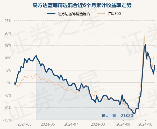 证券之星消息,10月18日,易方达蓝筹精选混合最新单位净值为1.8114元,累计净值为1.8114元,较前一交易日上涨3.22%。历史数据显示该基金近1个月上涨21.86%,近3个月上涨8.21%,近6个月上涨6.78%,近1年下跌6.04%。该基金近6个月的累计收益率走势如下图: