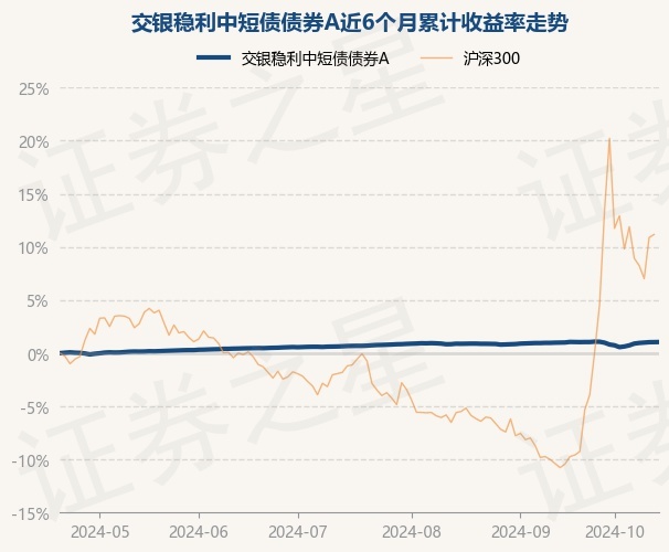 证券之星消息,10月21日,交银稳利中短债债券A最新单位净值为1.1559元,累计净值为1.1869元,较前一交易日上涨0.01%。历史数据显示该基金近1个月上涨0.01%,近3个月上涨0.34%,近6个月上涨1.05%,近1年上涨3.81%。该基金近6个月的累计收益率走势如下图: