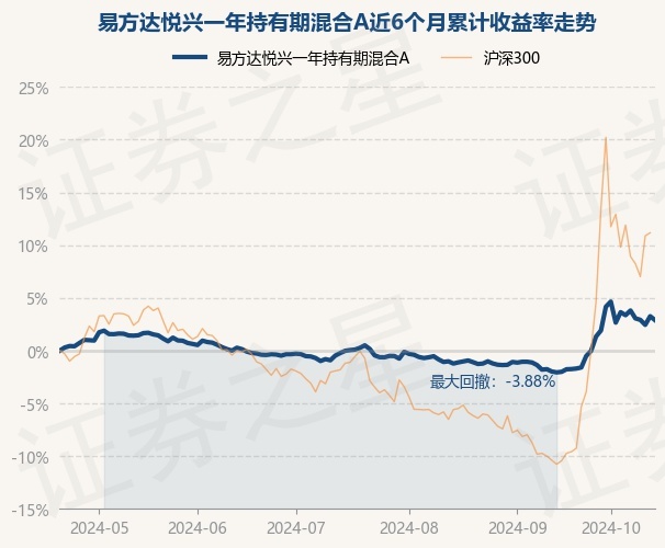 证券之星消息,10月21日,易方达悦兴一年持有期混合A最新单位净值为1.0232元,累计净值为1.0232元,较前一交易日下跌0.36%。历史数据显示该基金近1个月上涨4.66%,近3个月上涨2.37%,近6个月上涨2.89%,近1年上涨3.66%。该基金近6个月的累计收益率走势如下图: