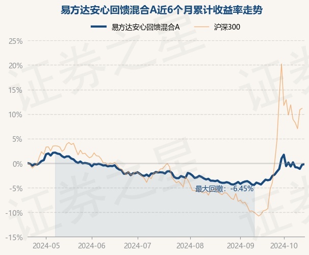 证券之星消息,10月21日,易方达安心回馈混合A最新单位净值为2.316元,累计净值为2.316元,较前一交易日上涨0.09%。历史数据显示该基金近1个月上涨3.39%,近3个月上涨1.45%,近6个月下跌0.22%,近1年上涨2.25%。该基金近6个月的累计收益率走势如下图: