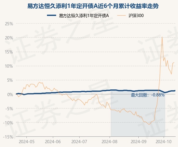 证券之星消息,10月21日,易方达恒久添利1年定开债A最新单位净值为1.019元,累计净值为1.478元,较前一交易日上涨0.1%。历史数据显示该基金近1个月下跌0.1%,近3个月上涨0.2%,近6个月上涨1.22%,近1年上涨4.61%。该基金近6个月的累计收益率走势如下图:
