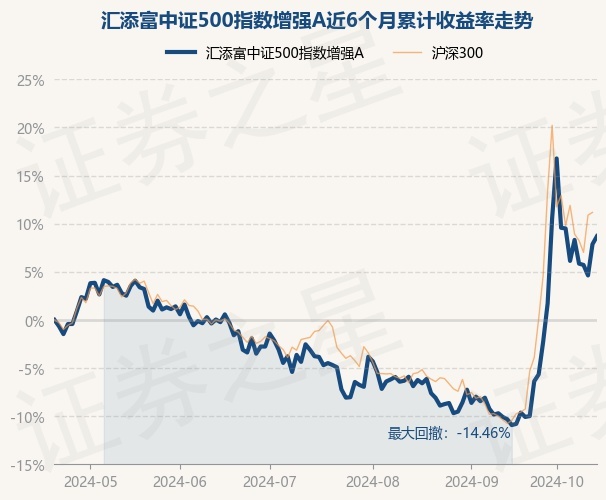 证券之星消息,10月21日,汇添富中证500指数增强A最新单位净值为1.5934元,累计净值为1.8584元,较前一交易日上涨0.77%。历史数据显示该基金近1个月上涨20.89%,近3个月上涨14.04%,近6个月上涨8.7%,近1年上涨11.98%。该基金近6个月的累计收益率走势如下图: