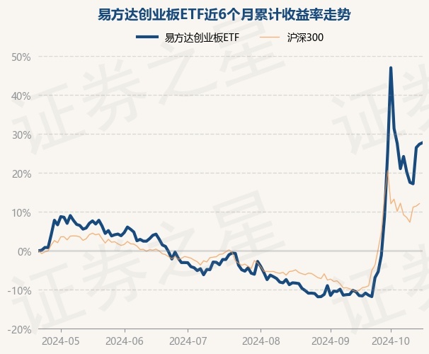 证券之星消息,10月22日,易方达创业板ETF最新单位净值为2.1754元,累计净值为2.4921元,较前一交易日上涨0.3%。历史数据显示该基金近1个月上涨44.22%,近3个月上涨28.61%,近6个月上涨27.77%,近1年上涨17.68%。该基金近6个月的累计收益率走势如下图: