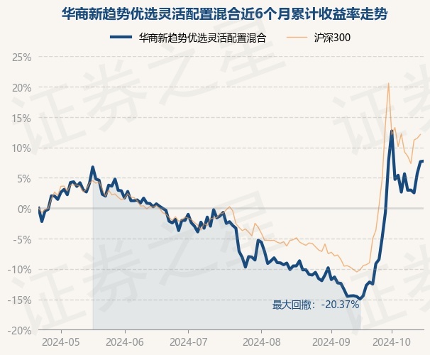 证券之星消息,10月22日,华商新趋势优选灵活配置混合最新单位净值为10.031元,累计净值为10.031元,较前一交易日上涨0.08%。历史数据显示该基金近1个月上涨22.66%,近3个月上涨11.42%,近6个月上涨7.74%,近1年上涨14.44%。该基金近6个月的累计收益率走势如下图: