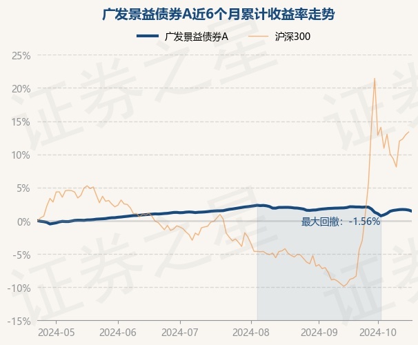 证券之星消息,10月23日,广发景益债券A最新单位净值为1.0822元,累计净值为1.0822元,较前一交易日下跌0.16%。历史数据显示该基金近1个月下跌0.62%,近3个月下跌0.27%,近6个月上涨1.44%,近1年上涨5.74%。该基金近6个月的累计收益率走势如下图: