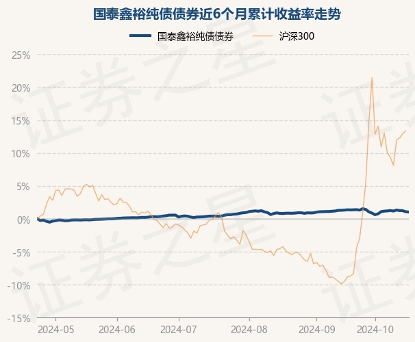 证券之星消息,10月23日,国泰鑫裕纯债债券最新单位净值为1.0273元,累计净值为1.0689元,较前一交易日下跌0.04%。历史数据显示该基金近1个月下跌0.35%,近3个月上涨0.41%,近6个月上涨1.04%,近1年上涨4.62%。该基金近6个月的累计收益率走势如下图:
