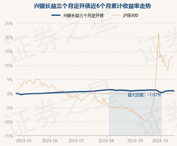 证券之星消息,10月23日,兴银长益三个月定开债最新单位净值为1.013元,累计净值为1.3189元,较前一交易日下跌0.09%。历史数据显示该基金近1个月上涨1.11%,近3个月下跌0.1%,近6个月上涨0.84%,近1年上涨4.0%。该基金近6个月的累计收益率走势如下图: