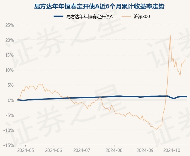 证券之星消息,10月23日,易方达年年恒春定开债A最新单位净值为1.0119元,累计净值为1.1376元,较前一交易日下跌0.09%。历史数据显示该基金近1个月下跌0.23%,近3个月上涨0.03%,近6个月上涨0.98%,近1年上涨3.96%。该基金近6个月的累计收益率走势如下图: