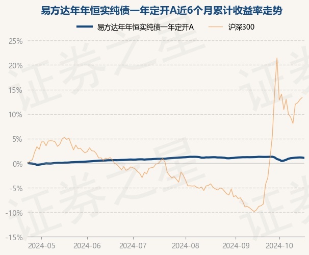 证券之星消息,10月23日,易方达年年恒实纯债一年定开A最新单位净值为1.0218元,累计净值为1.15元,较前一交易日下跌0.08%。历史数据显示该基金近1个月下跌0.2%,近3个月上涨0.06%,近6个月上涨1.06%,近1年上涨4.29%。该基金近6个月的累计收益率走势如下图: