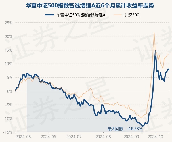 证券之星消息,10月23日,华夏中证500指数智选增强A最新单位净值为1.0064元,累计净值为1.0064元,较前一交易日上涨0.0%。历史数据显示该基金近1个月上涨22.75%,近3个月上涨17.38%,近6个月上涨8.15%,近1年上涨11.88%。该基金近6个月的累计收益率走势如下图: