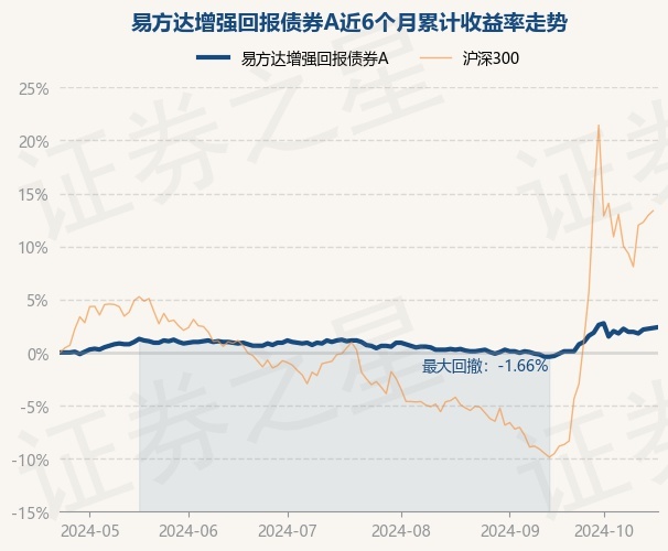 证券之星消息,10月23日,易方达增强回报债券A最新单位净值为1.397元,累计净值为2.584元,较前一交易日上涨0.07%。历史数据显示该基金近1个月上涨2.27%,近3个月上涨1.67%,近6个月上涨2.39%,近1年上涨10.88%。该基金近6个月的累计收益率走势如下图: