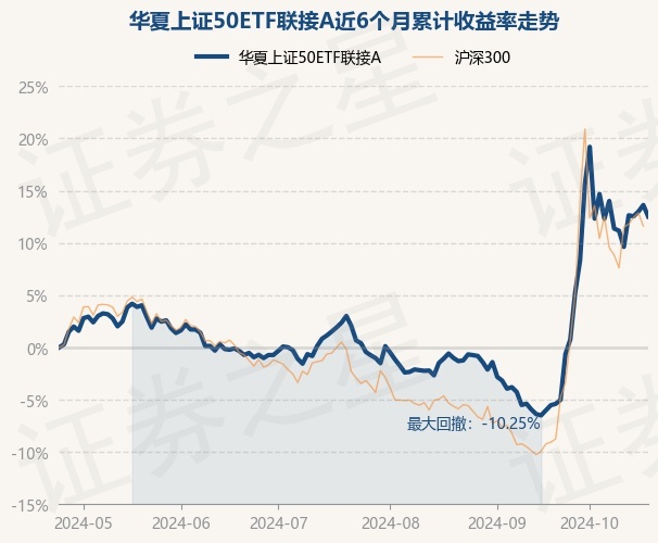 证券之星消息,10月24日,华夏上证50ETF联接A最新单位净值为0.9607元,累计净值为1.0165元,较前一交易日下跌0.97%。历史数据显示该基金近1个月上涨13.24%,近3个月上涨12.06%,近6个月上涨12.52%,近1年上涨14.6%。该基金近6个月的累计收益率走势如下图: