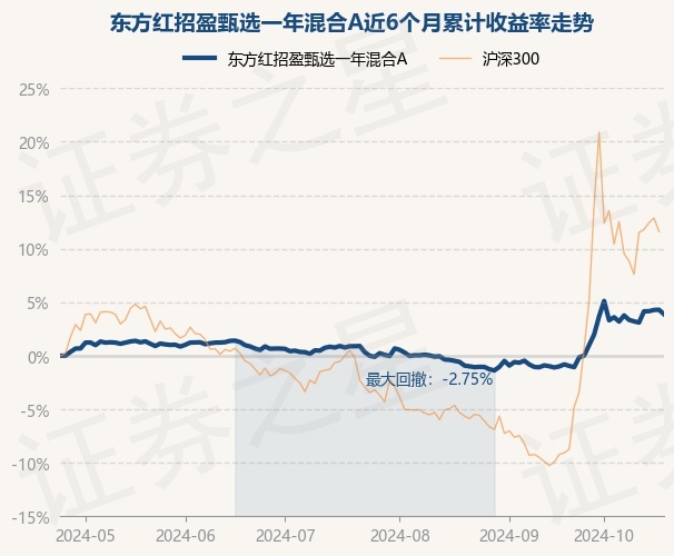 证券之星消息,10月24日,东方红招盈甄选一年混合A最新单位净值为1.0513元,累计净值为1.1305元,较前一交易日下跌0.4%。历史数据显示该基金近1个月上涨4.04%,近3个月上涨3.89%,近6个月上涨3.88%,近1年上涨5.36%。该基金近6个月的累计收益率走势如下图: