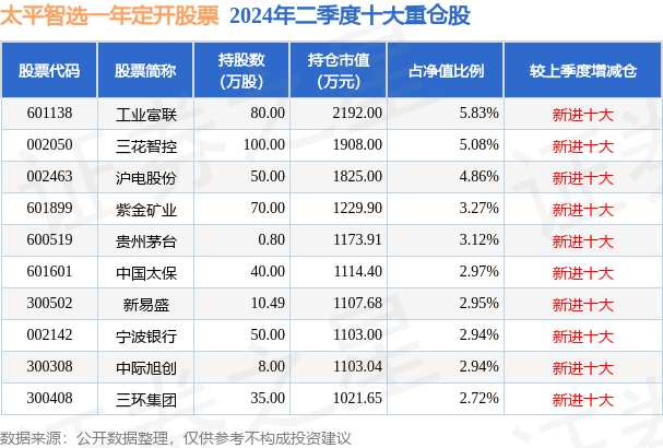 太平智选一年定开股票为股票型基金,根据最新一期基金季报显示,该基金资产配置:股票占净值比82.74%,债券占净值比0.26%,现金占净值比11.6%。基金十大重仓股如下: