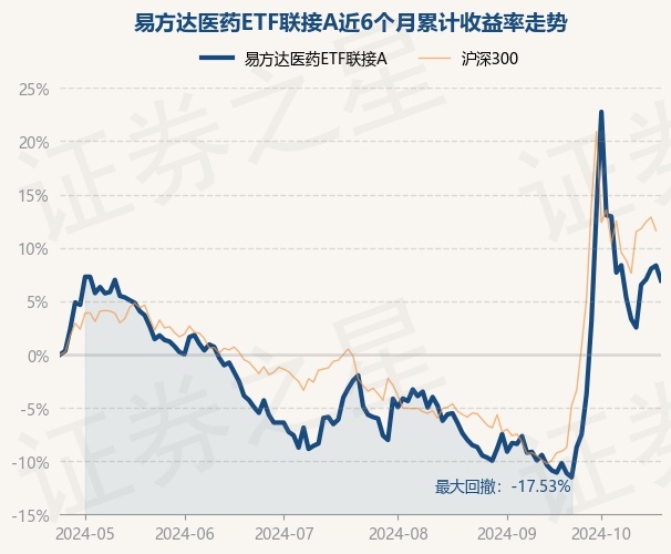 证券之星消息,10月24日,易方达医药ETF联接A最新单位净值为0.9219元,累计净值为0.9219元,较前一交易日下跌1.3%。历史数据显示该基金近1个月上涨17.14%,近3个月上涨13.35%,近6个月上涨6.94%,近1年下跌8.05%。该基金近6个月的累计收益率走势如下图:
