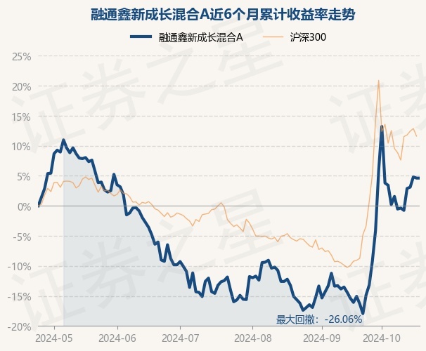 证券之星消息,10月24日,融通鑫新成长混合A最新单位净值为1.0783元,累计净值为1.0783元,较前一交易日上涨0.0%。历史数据显示该基金近1个月上涨22.26%,近3个月上涨23.9%,近6个月上涨4.1%,近1年下跌5.71%。该基金近6个月的累计收益率走势如下图: