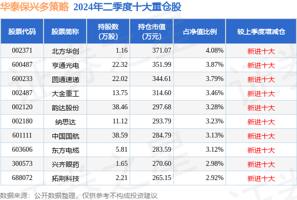 华泰保兴多策略为股票型基金,根据最新一期基金季报显示,该基金资产配置:股票占净值比87.21%,无债券类资产,现金占净值比13.88%。基金十大重仓股如下: