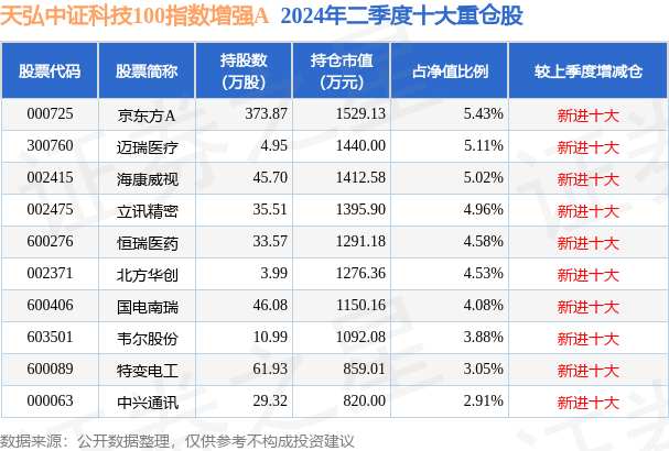 天弘中证科技100指数增强A为指数型-股票基金,根据最新一期基金季报显示,该基金资产配置:股票占净值比94.43%,无债券类资产,现金占净值比5.7%。基金十大重仓股如下: