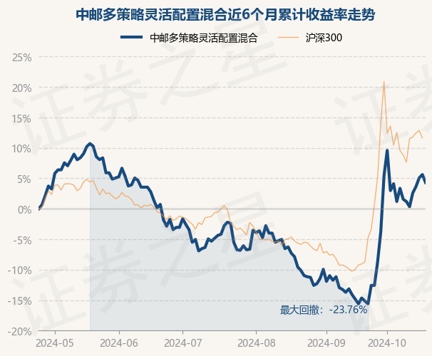 证券之星消息,10月24日,中邮多策略灵活配置混合最新单位净值为1.106元,累计净值为1.527元,较前一交易日下跌1.25%。历史数据显示该基金近1个月上涨19.31%,近3个月上涨11.83%,近6个月上涨4.35%,近1年下跌2.67%。该基金近6个月的累计收益率走势如下图: