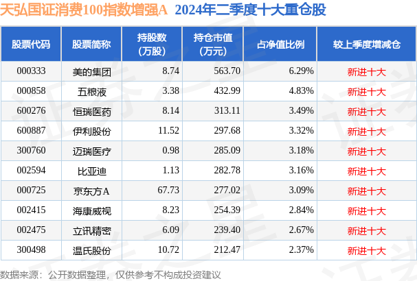 天弘国证消费100指数增强A为指数型-股票基金,根据最新一期基金季报显示,该基金资产配置:股票占净值比94.5%,债券占净值比3.51%,现金占净值比2.11%。基金十大重仓股如下: