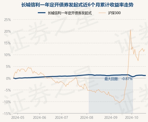 证券之星消息,10月25日,长城信利一年定开债券发起式最新单位净值为1.0515元,累计净值为1.084元,较前一交易日上涨0.0%。历史数据显示该基金近1个月下跌0.31%,近3个月下跌0.1%,近6个月上涨1.07%,近1年上涨4.16%。该基金近6个月的累计收益率走势如下图: