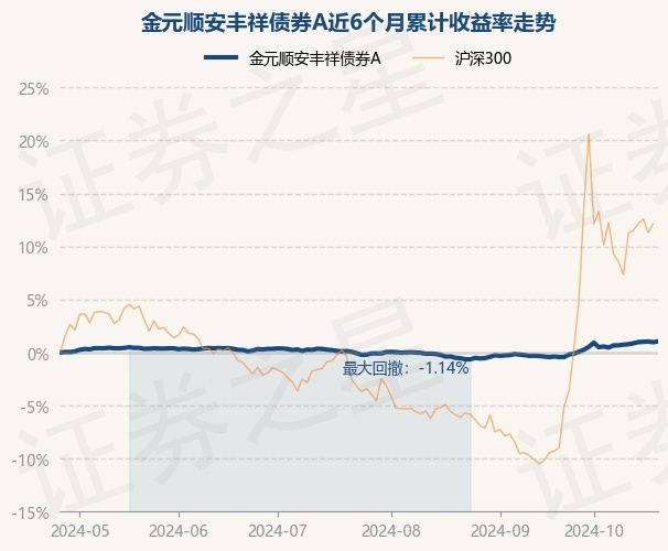 证券之星消息,10月25日,金元顺安丰祥债券A最新单位净值为1.0996元,累计净值为1.5466元,较前一交易日上涨0.08%。历史数据显示该基金近1个月上涨1.16%,近3个月上涨1.26%,近6个月上涨1.06%,近1年上涨2.92%。该基金近6个月的累计收益率走势如下图: