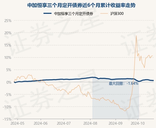 证券之星消息,10月28日,中加恒享三个月定开债券最新单位净值为1.0272元,累计净值为1.0801元,较前一交易日上涨0.0%。历史数据显示该基金近1个月下跌0.44%,近3个月下跌0.94%,近6个月上涨0.53%,近1年上涨3.58%。该基金近6个月的累计收益率走势如下图: