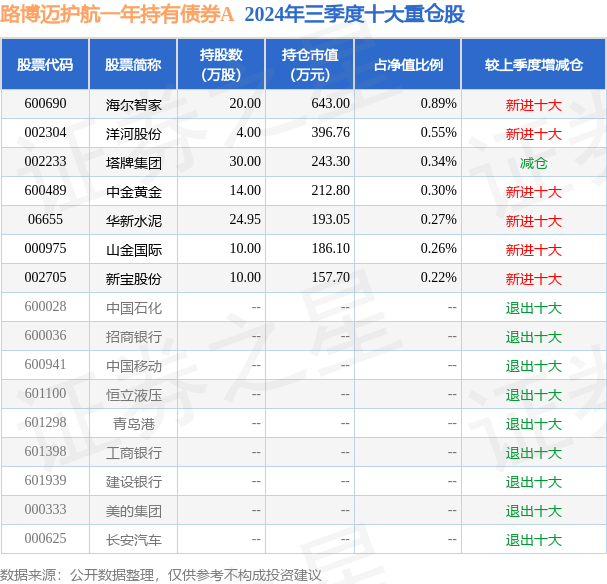 路博迈护航一年持有债券A为债券型-混合二级基金,根据最新一期基金季报显示,该基金资产配置:股票占净值比2.82%,债券占净值比110.13%,现金占净值比0.66%。基金十大重仓股如下: