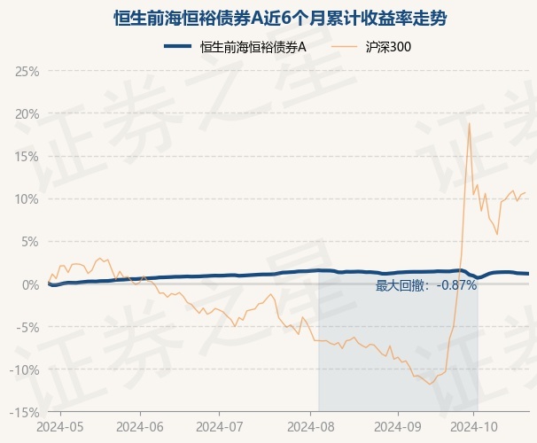 证券之星消息,10月28日,恒生前海恒裕债券A最新单位净值为1.0251元,累计净值为1.1232元,较前一交易日下跌0.02%。历史数据显示该基金近1个月下跌0.23%,近3个月下跌0.2%,近6个月上涨1.14%,近1年上涨4.5%。该基金近6个月的累计收益率走势如下图: