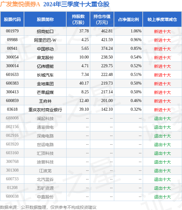 广发集悦债券A为债券型-混合二级基金,根据最新一期基金季报显示,该基金资产配置:股票占净值比21.01%,债券占净值比103.5%,现金占净值比1.92%。基金十大重仓股如下: