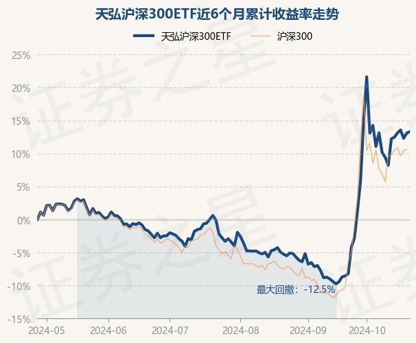 证券之星消息,10月28日,天弘沪深300ETF最新单位净值为1.1093元,累计净值为1.1093元,较前一交易日上涨0.19%。历史数据显示该基金近1个月上涨6.99%,近3个月上涨16.69%,近6个月上涨13.3%,近1年上涨13.96%。该基金近6个月的累计收益率走势如下图: