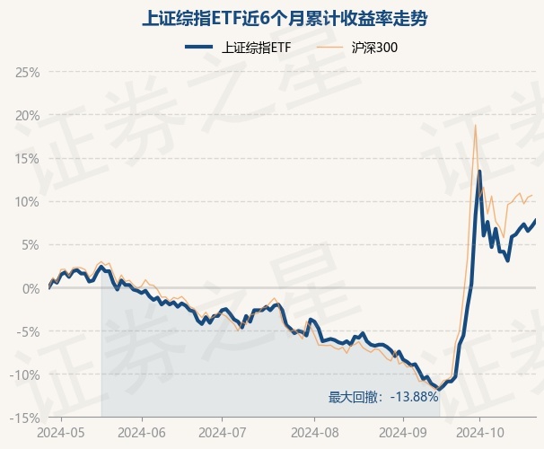 证券之星消息,10月28日,上证综指ETF最新单位净值为0.811元,累计净值为1.687元,较前一交易日上涨0.62%。历史数据显示该基金近1个月上涨7.28%,近3个月上涨13.43%,近6个月上涨7.7%,近1年上涨9.43%。该基金近6个月的累计收益率走势如下图: