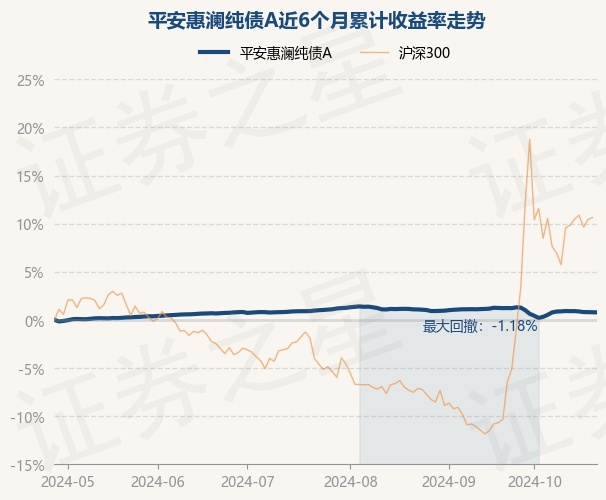 证券之星消息,10月28日,平安惠澜纯债A最新单位净值为1.1076元,累计净值为1.1926元,较前一交易日下跌0.02%。历史数据显示该基金近1个月下跌0.23%,近3个月下跌0.32%,近6个月上涨0.78%,近1年上涨3.83%。该基金近6个月的累计收益率走势如下图: