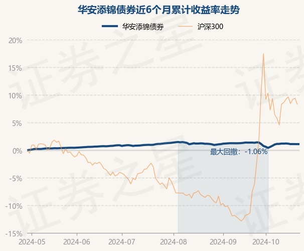 证券之星消息,10月29日,华安添锦债券最新单位净值为1.0377元,累计净值为1.0557元,较前一交易日上涨0.0%。历史数据显示该基金近1个月下跌0.01%,近3个月下跌0.17%,近6个月上涨1.11%,近1年上涨3.42%。该基金近6个月的累计收益率走势如下图: