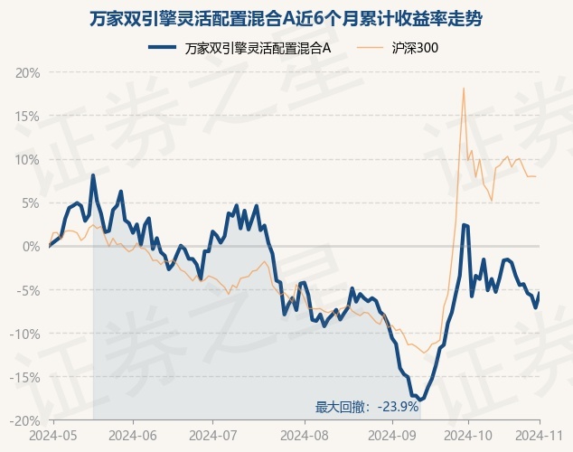 证券之星消息,10月30日,万家双引擎灵活配置混合A最新单位净值为2.1193元,累计净值为3.2593元,较前一交易日下跌0.3%。历史数据显示该基金近1个月下跌7.94%,近3个月上涨1.79%,近6个月下跌5.75%,近1年上涨14.31%。该基金近6个月的累计收益率走势如下图: