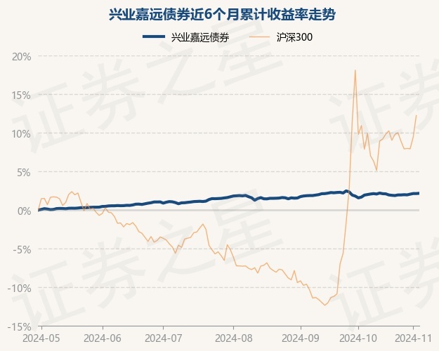 证券之星消息,10月31日,兴业嘉远债券最新单位净值为1.0221元,累计净值为1.0481元,较前一交易日上涨0.09%。历史数据显示该基金近1个月上涨0.25%,近3个月上涨0.34%,近6个月上涨2.06%,近1年上涨4.63%。该基金近6个月的累计收益率走势如下图: