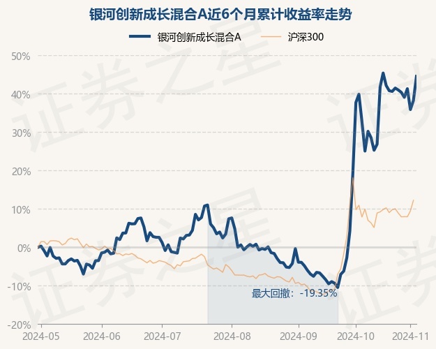 证券之星消息,10月31日,银河创新成长混合A最新单位净值为5.7141元,累计净值为5.7141元,较前一交易日上涨1.62%。历史数据显示该基金近1个月上涨18.32%,近3个月上涨31.56%,近6个月上涨41.32%,近1年上涨22.47%。该基金近6个月的累计收益率走势如下图: