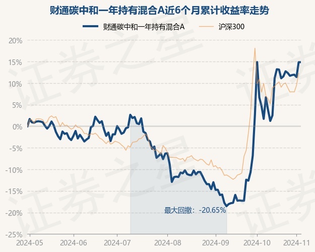 证券之星消息,11月1日,财通碳中和一年持有混合A最新单位净值为0.9771元,累计净值为0.9771元,较前一交易日上涨0.0%。历史数据显示该基金近1个月上涨8.41%,近3个月上涨18.85%,近6个月上涨11.4%,近1年上涨26.11%。该基金近6个月的累计收益率走势如下图:
