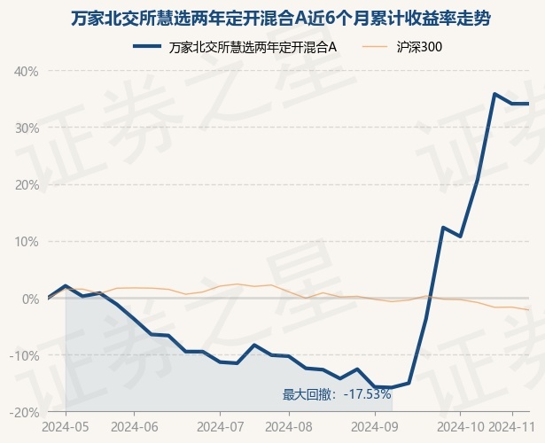 证券之星消息,11月1日,万家北交所慧选两年定开混合A最新单位净值为1.1312元,累计净值为1.1312元,较前一交易日下跌1.27%。历史数据显示该基金近1个月上涨19.38%,近3个月上涨49.2%,近6个月上涨34.11%,近1年上涨51.68%。该基金近6个月的累计收益率走势如下图:
