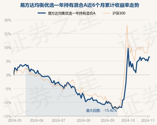 证券之星消息,11月1日,易方达均衡优选一年持有混合A最新单位净值为1.0674元,累计净值为1.0674元,较前一交易日下跌0.6%。历史数据显示该基金近1个月上涨0.9%,近3个月上涨13.35%,近6个月上涨5.0%,近1年上涨5.51%。该基金近6个月的累计收益率走势如下图: