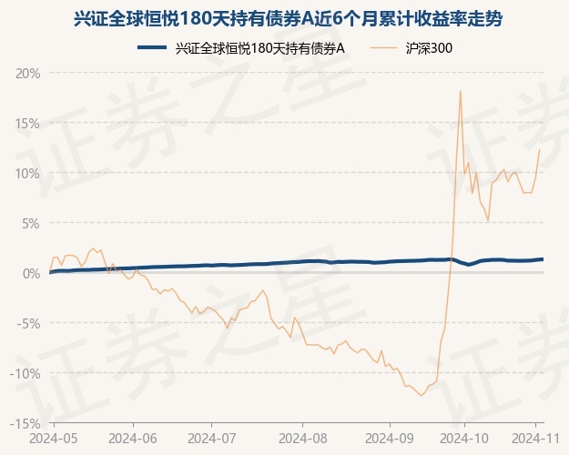 证券之星消息,11月1日,兴证全球恒悦180天持有债券A最新单位净值为1.1188元,累计净值为1.1188元,较前一交易日上涨0.05%。历史数据显示该基金近1个月上涨0.26%,近3个月上涨0.16%,近6个月上涨1.24%,近1年上涨4.19%。该基金近6个月的累计收益率走势如下图: