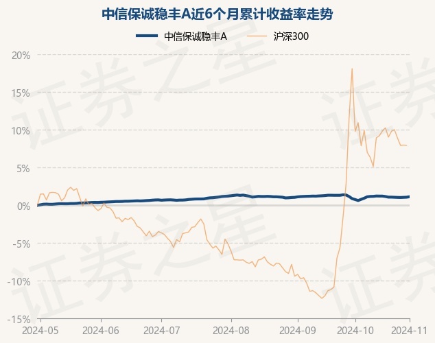 证券之星消息,11月1日,中信保诚稳丰A最新单位净值为1.0839元,累计净值为1.2905元,较前一交易日上涨0.06%。历史数据显示该基金近1个月上涨0.25%,近3个月下跌0.13%,近6个月上涨1.14%,近1年上涨3.21%。该基金近6个月的累计收益率走势如下图: