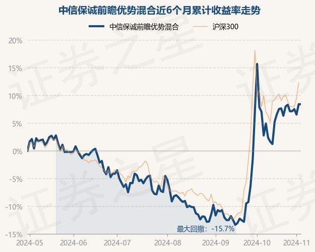 证券之星消息,11月1日,中信保诚前瞻优势混合最新单位净值为0.7917元,累计净值为0.7917元,较前一交易日下跌0.93%。历史数据显示该基金近1个月下跌0.81%,近3个月上涨12.49%,近6个月上涨6.54%,近1年下跌3.65%。该基金近6个月的累计收益率走势如下图: